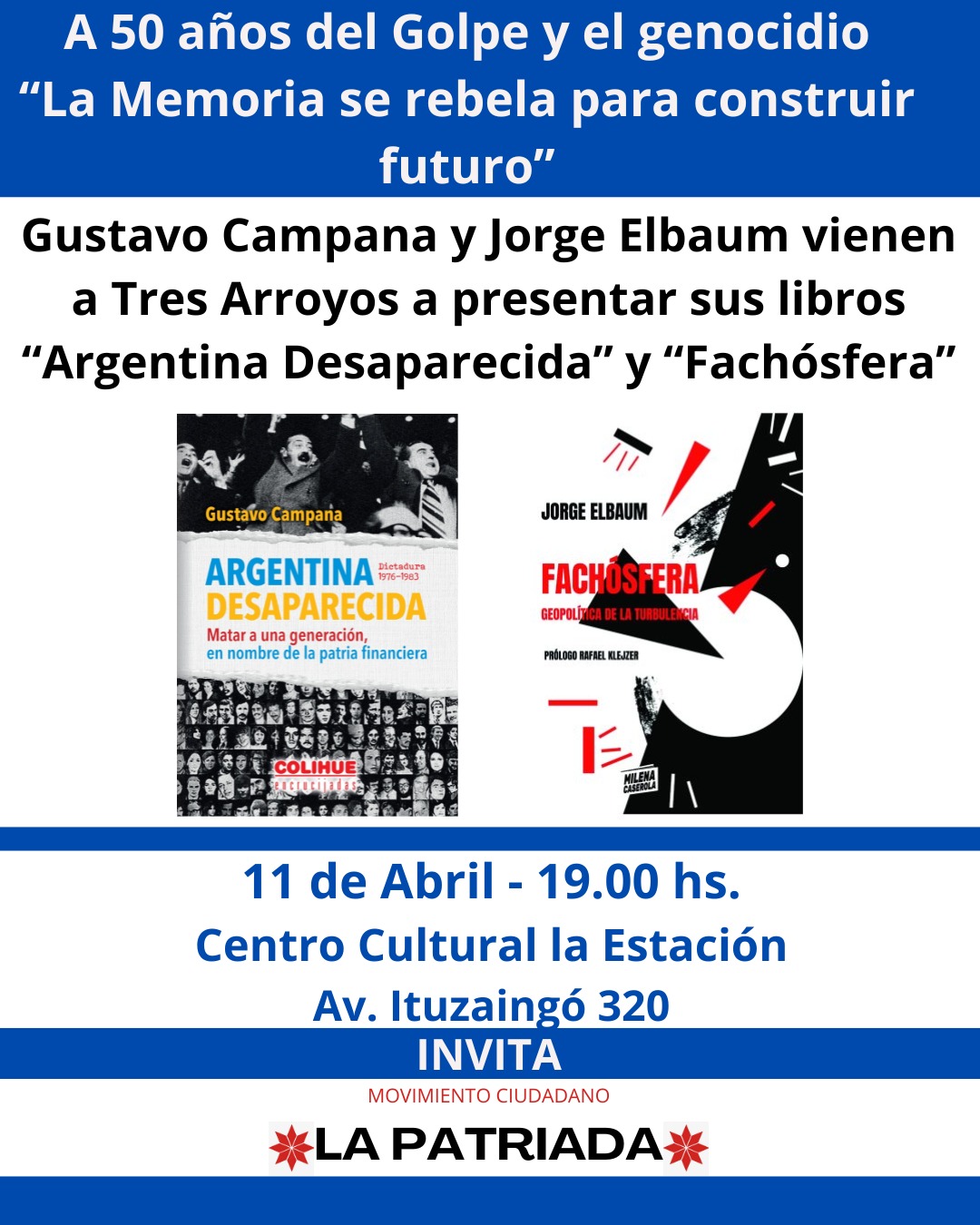 El sábado 11 de Abril, llegan a Tres Arroyos Gustavo Campana y Jorge Elbaum a presentar sus libros “Argentina Desaparecida”…