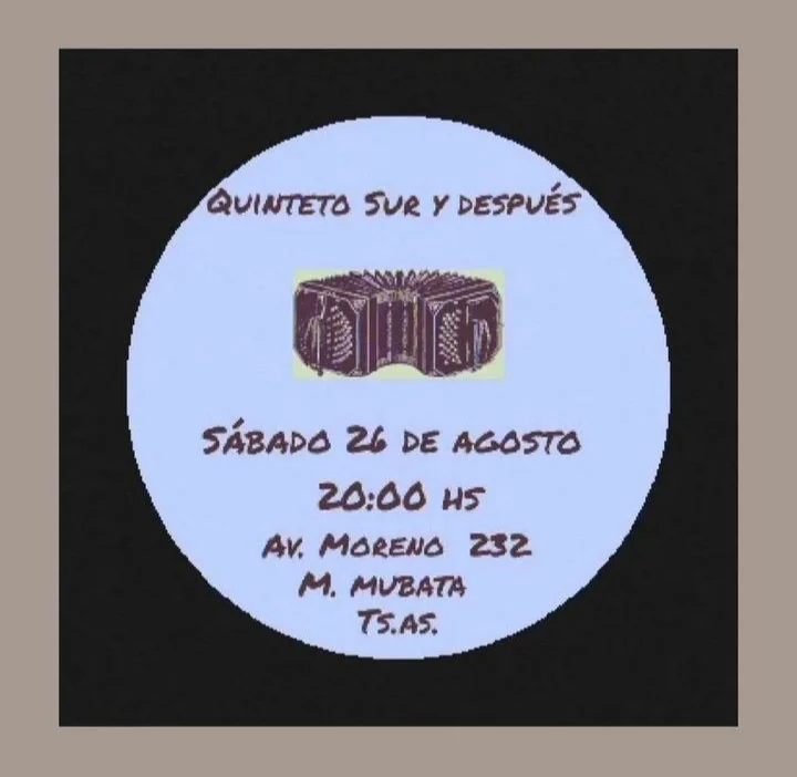 El MUBATA invita a la presentación de la orquesta de tango “Quinteto Sur y después”. La misma sera este sábado…