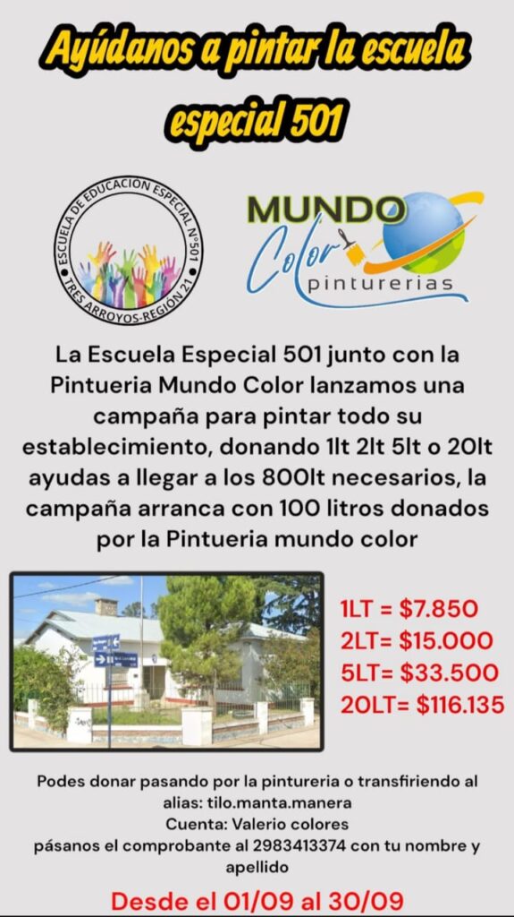 La Escuela de Educación Especial Nº 501 de Tres Arroyos lanzó una campaña solidaria junto a Pinturería Mundo Color para renovar por completo la pintura del establecimiento. El objetivo es reunir 800 litros de pintura, y todos podemos colaborar.