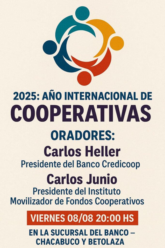 En el marco del Año Internacional de las Cooperativas 2025, este viernes 8 de agosto a las 20:00 hs se realizará una charla via zoom e imperdible en la sucursal del Banco Credicoop de Tres Arroyos, ubicada en la esquina de Chacabuco y Betolaza.