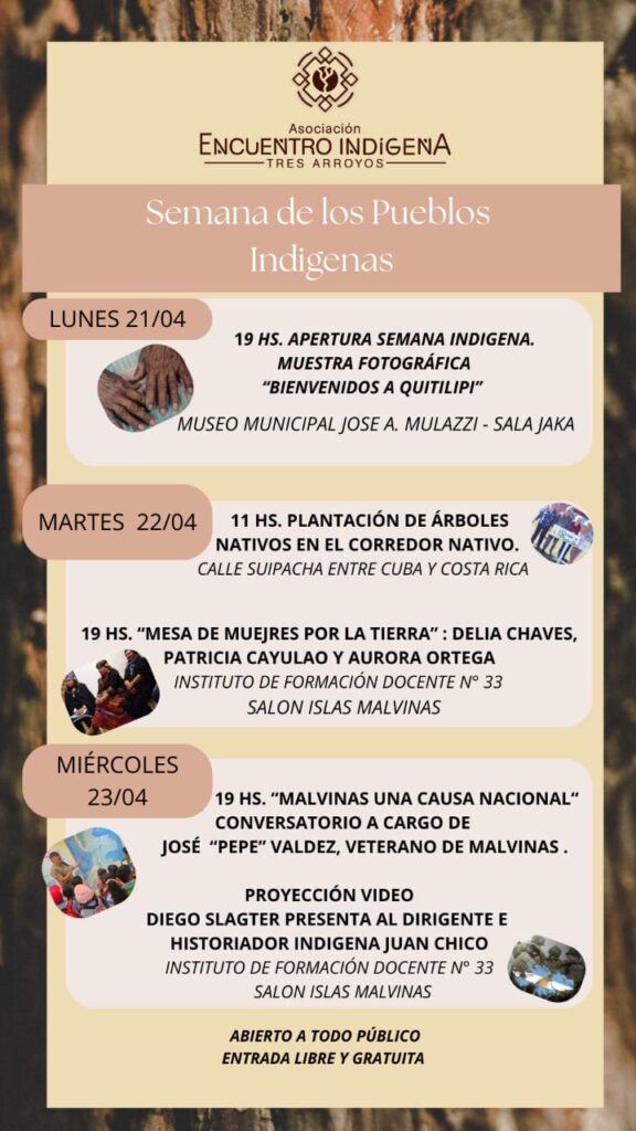 Del 21 al 23 de abril, la Asociación Encuentro Indígena de Tres Arroyos organiza una serie de actividades abiertas a la comunidad en el marco de la Semana de los Pueblos Indígenas, con entrada libre y gratuita.