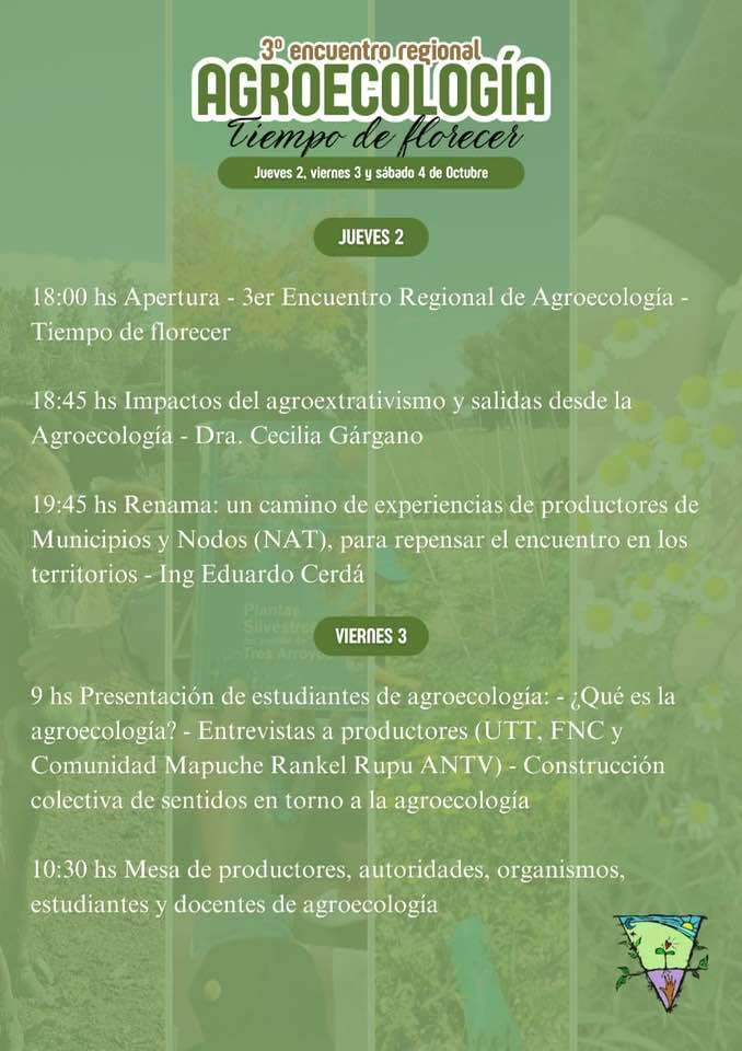 Entre las actividades destacadas figuran la participación de la Dra. Cecilia Gárgano, que disertará sobre los impactos del extractivismo y las alternativas desde la agroecología, y del Ing. Eduardo Cerdá, con la presentación de experiencias de productores nucleados en RENAMA. También habrá rondas de diálogo con comunidades indígenas, como la Comunidad Mapuche Rankel Rupu ANTV de Lincoln, y producciones locales de permacultura.