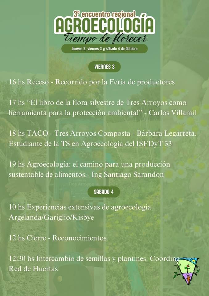 Del jueves 2 al sábado 4 de octubre, Tres Arroyos será sede del 3º Encuentro Regional de Agroecología “Tiempo de Florecer”, una propuesta abierta a toda la comunidad que invita a reflexionar y compartir experiencias en torno a nuevas formas de producir y habitar los territorios.