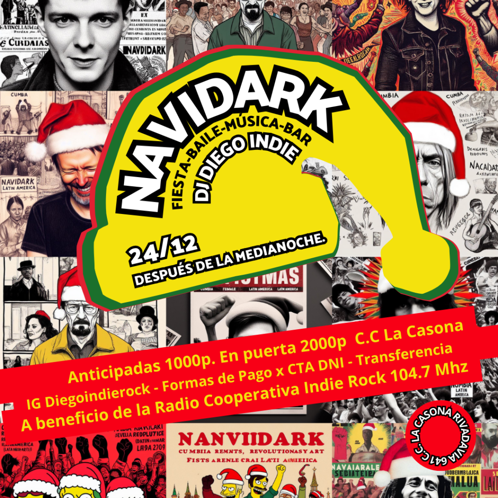 Las entradas vienen con una calco de regalo  de la serie “Navidark 2023” desarrolladas con IA. Las mismas se pueden adquirir en Rivadavia 641, de lunes a viernes de 17 a 20 hs o por IG diegoindierock Las mismas tienen un valor de 1000 pesos anticipada y 2000 en puerta. Parte de lo recaudado será destinado a la Cooperativa de Trabajo Indie Rock Comunicación Colectiva y Comunitaria Ltda. afectada por el temporal y que dejó fuera del aire la radio que gestiona dicha Cooperativa, es decir, la Radio Cooperativa Indie Rock 104.7 mhz. Invitamos a la comunidad a vivir una noche diferente el 24 de Diciembre pasada la media noche, en La Casona, Rivadavia 641.