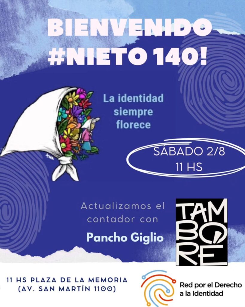 Este sábado 2 de agosto a las 11 de la mañana, en la Plaza de la Memoria (Av. San Martín 1100), nos reunimos para celebrar una noticia que conmueve y nos llena de esperanza: la restitución de la identidad del Nieto 140.