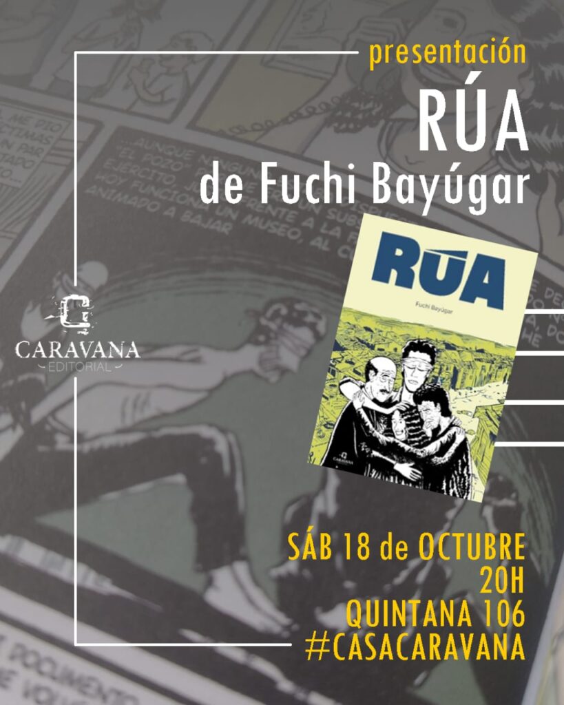 El sábado 18 de octubre a partir de las 20h la Cooperativa de Trabajo Editorial Caravana presentará Rúa, historieta de Fuchi Bayúgar en Casa Caravana (Calle Quintana 106, Tres Arroyos).