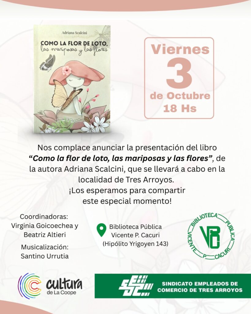 El viernes 3 de octubre a las 18 hs. en instalaciones de la Biblioteca Pública “Vicente P. Cacuri” del Sindicato Empleados de Comercio de nuestra ciudad, se realizará la presentación del libro “Como la flor de loto, las mariposas y las flores” de la autora Adriana Scalcini.